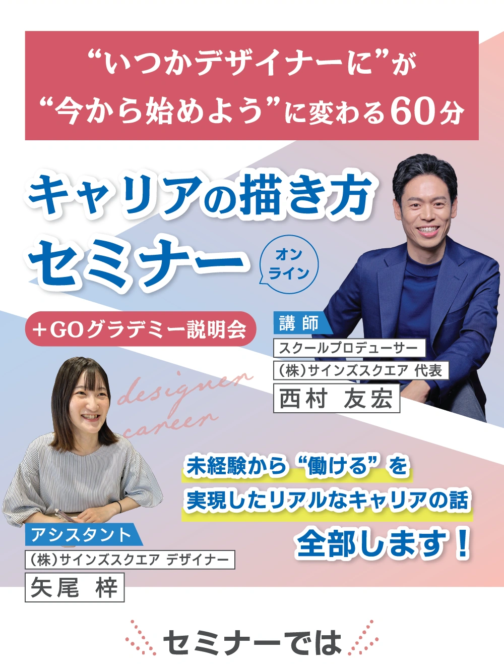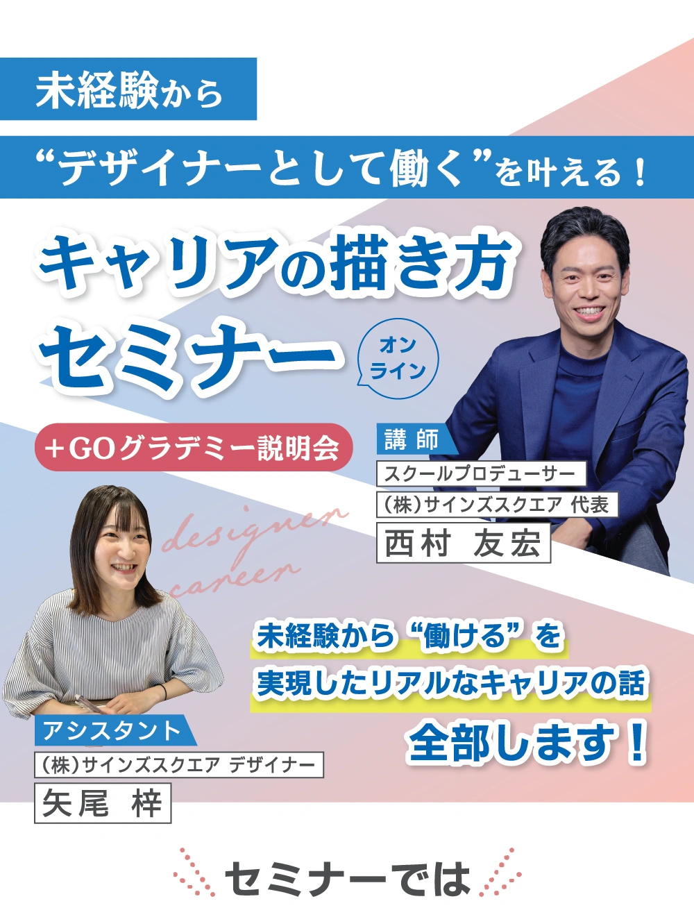 【注意事項】 ※セキュリティの関係上、Zoom情報は個別にメールにてご連絡します。 開催直前のお申し込みについては確認できない場合があるので、できるだけ前日までにお申し込みください。 ・ Zoomを使ったことのない方は、早めに準備、入室することをおすすめします。 ・インターネット回線が安定した場所でのご参加をお願いします。移動しながらのご参加はお控えください。 ・本セミナーはウェビナーのため、参加者さまのカメラ・マイクはオフになっております。 ・質疑応答に関しましては、ウェビナー内のチャットで承っております。 ・スマートフォンでもご参加いただけますが、パソコンでのご参加を推奨します。